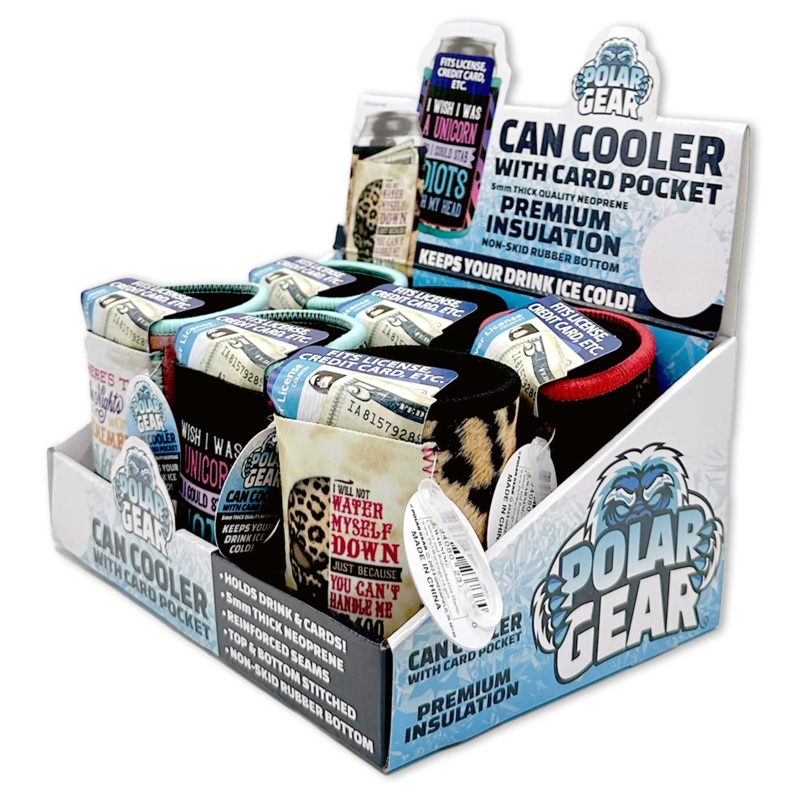 5mm thick neoprene can cooler. Insulated design prevents condensation, keeping hands dry! Top and bottom are stitched to a non-skid rubber bottom that keeps it in place. Each display includes a variety of artwork. Holds 12 oz cans and features a pocket to hold cash, coins, cards, and more!
