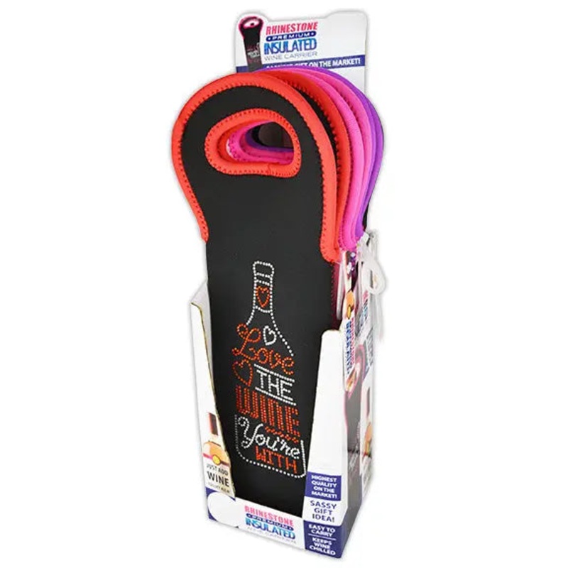 Sassy gift idea! Premium insulated wine bottlecarriers keep your bottleschilled! 5mm THICK quality neoprene for premium insulation. Each display includes a variety of rhinestone artwork.Reinforced seams, top & bottom stitched. Highest quality on the market!