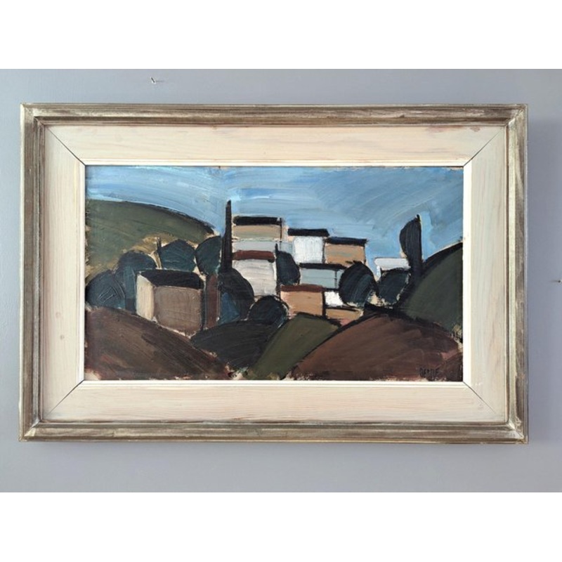 A mid century modernist landscape composition in oil, painted onto board. This painting depicts a stylized landscape with a village nestled among rolling hills and trees. The composition is characterized by bold, expressive brushstrokes and a rich earthy colour palette dominated by deep greens, browns, and blues, creating a sense of depth and structure. The use of thick, confident strokes and dark outlines around elements lends the painting a strong structural quality, while the earthy hues evoke a warm, rustic atmosphere. The artists expressive technique captures the essence of the village and its surrounding landscape in an abstract yet evocative manner. The painting is housed in a wood frame that has a faint silvery tint to it. The painting is in excellent vintage condition. The frame has some slight wear but in keeping with vintage style. Size: 44.5 x 67 cm (including frame)