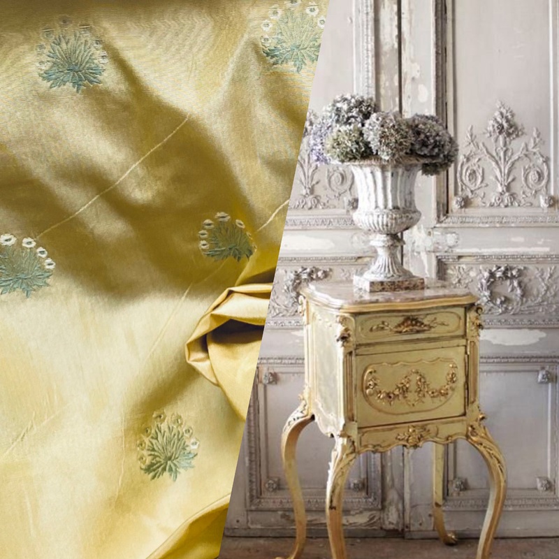 One of our absolute favorite new fabrics Imported from India! Inspired by french interiors, this incredibly beautiful 100% silk fabric has a gorgeous incredibly detailed embroidered medallion motif cascading across the fabric. Photos do not do this fabric