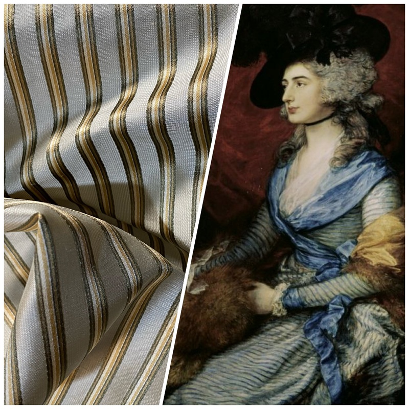 A beautiful Designer 100% Silk Taffeta Dupioni in a beautiful Bluewith a gold, taupe, khaki, green striped motif. Can be used for interior decorating, pillows, duvets, shams, drapery or dress and skirts garments. Sold by the yard. 55 wide.Will combine ship