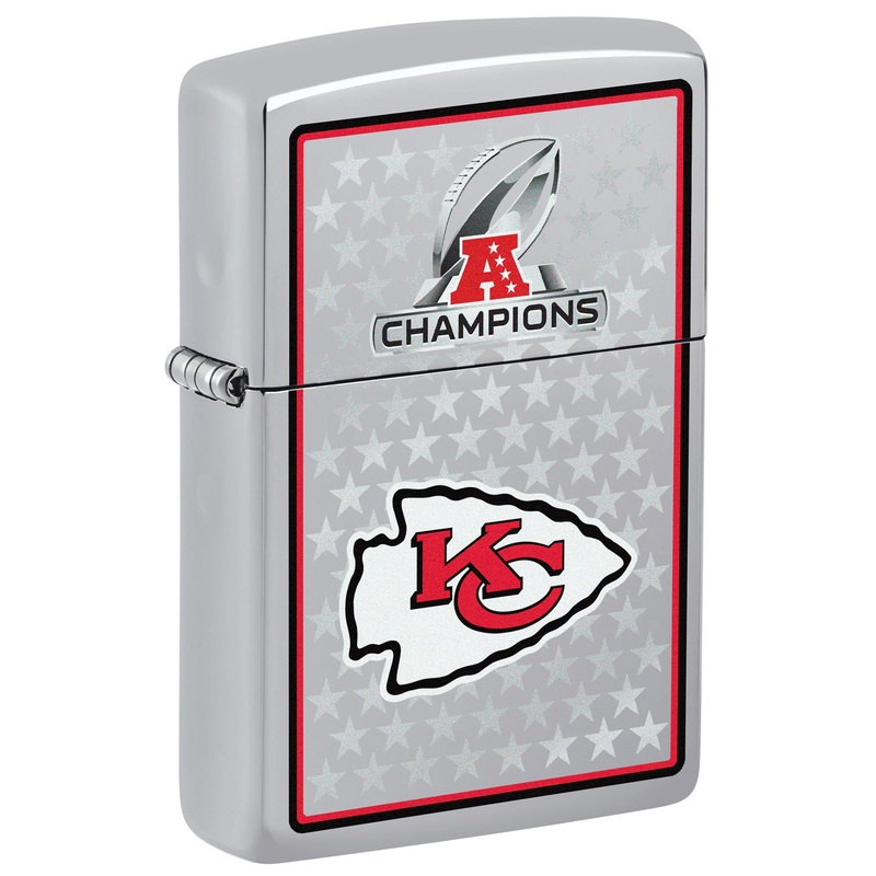 Gear up for the Big Game with Zippos first-ever AFC Champions commemorative lighter. The gleaming High Polish Chrome lighter features the Kansas City Chiefs logo beneath the AFC Champions logo in a star-studded Color Image design. Order now to claim the pe
