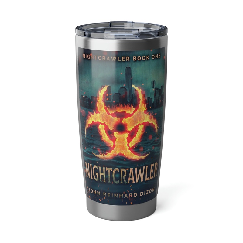 Minimize your plastic footprint with style. This tumbler fits perfectly into car cup holders, and the rubber gasket makes it spill-resistant on bumpier roads. The double-wall insulation makes sure drinks stay at the right temperature until the next pit stop. The cover art in this 20 oz tumbler is from John Reinhard Dizon’s book, Nightcrawler.