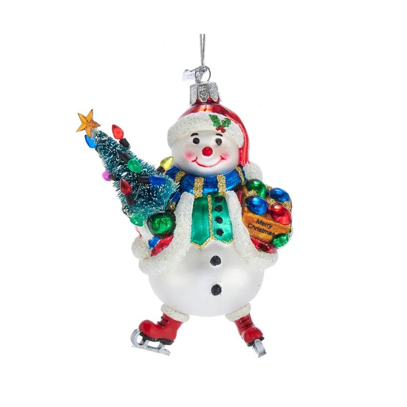 This Noble Gems glass snowman ornament from Kurt Adler is a charming addition to any home or holiday dcor. This snowman is wearing a red and white glittered coat, a blue and gold glittered scarf and a Santa hat. He is carrying a decorated Christmas tree in