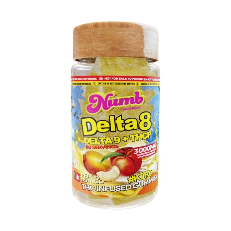 Delta 8, Delta 9, and THC-P infused Gummies! 3000mg per jar 20 gummies per jar 150mg per gummy Three flavors to choose from Blend of Delta 8, Delta 9, and THC-P Resealable lid Lab tested Description Numb Delta 8 Gummies pack a punch! With 3000mg per jar, 2