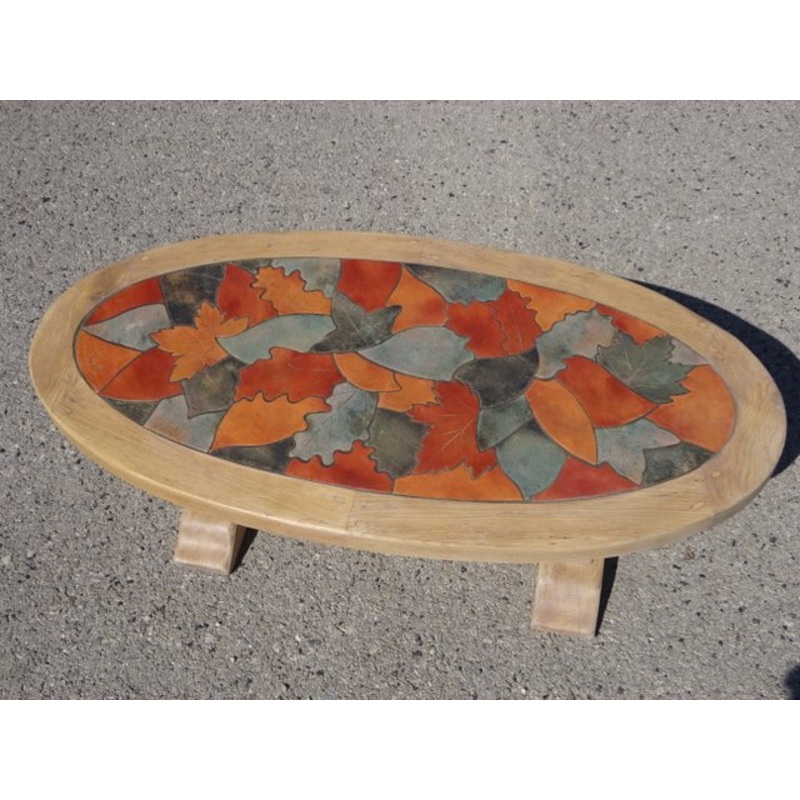 Oval tray, Vallauris ceramic in the shape of colorful leaves, pretty pastel shades. Solid oak structure, monastery table style base, stable and plush.Beautiful coffee table from the 1950s, unique and original piece,French-made ceramic signed by the ceramis