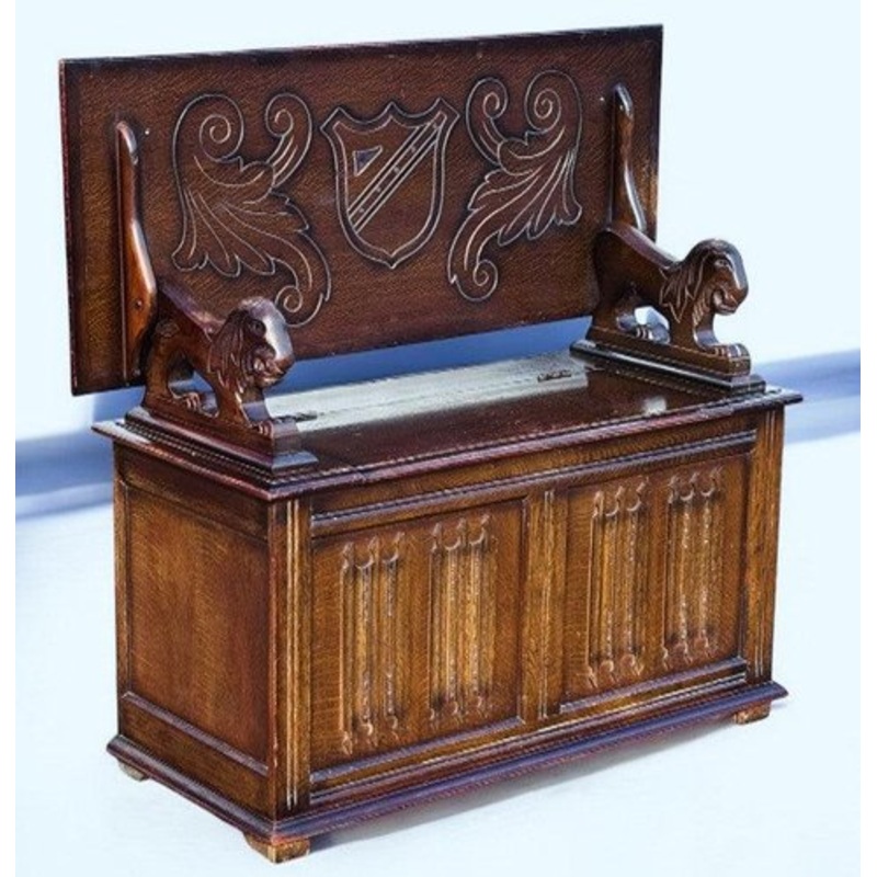Oak Monks Hall Bench, Carved Lions, Heraldic Crest, Storage To Base Top folds down to be used as a table Storage in base via a lift up lid. Strong & Solid. Sizes :- 101 cms high, 75 cms high as a table, 106 cms wide, 44.5 cms depth. This is a used old item so will show signs of use and wear, see pics.