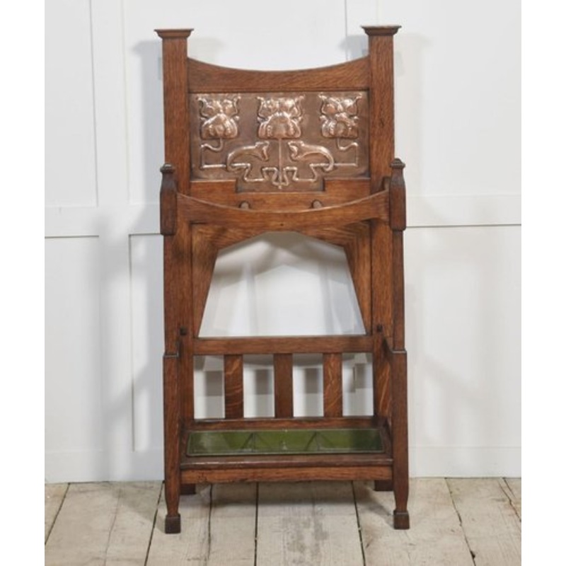 Oak Shapland and Petter Umbrella stand with copper repousse back panel over twinned umbrella receptacles over removable drip tray. All raised up on stylised feet. Dimensions Height 43 Inches Width 22.5 Inches Depth 10.5 Inches