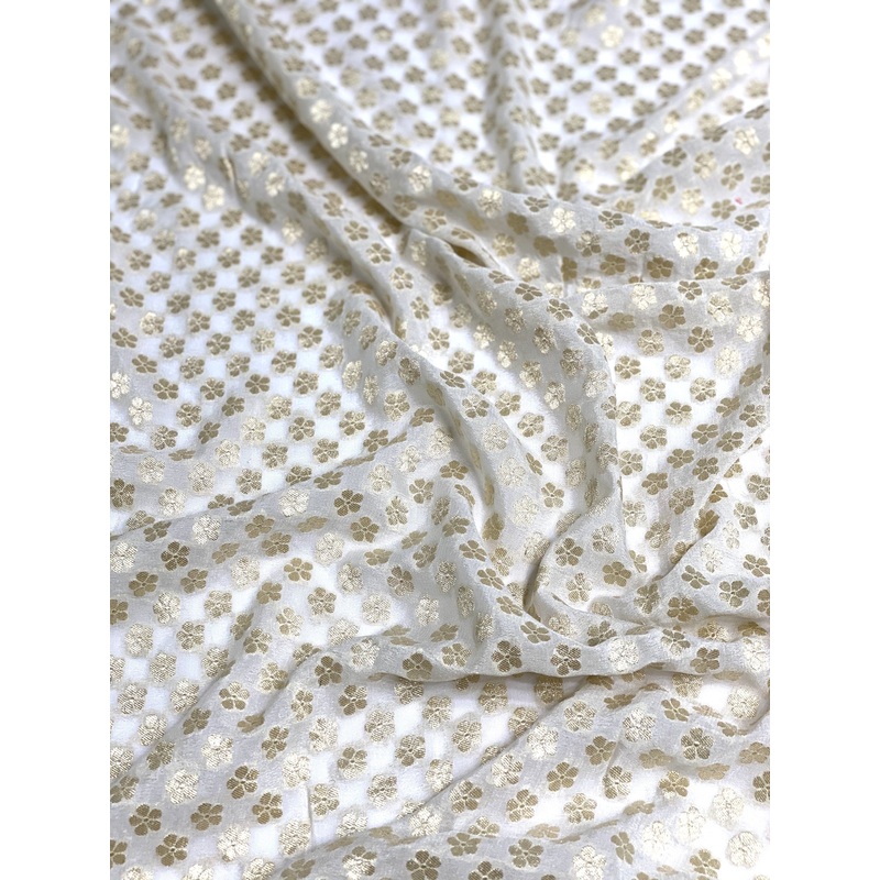 Our Off-White Gold Flower Silk Blend Novelty 1083 Fabric is truly ideal for special events such as costume parties, proms, weddings, bridal showers, cotillion, anniversaries and many other events! This fabric consists of 70% Silk and 30% Metallic and is 44