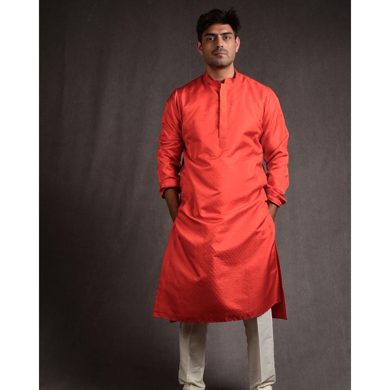 Orange Banarasi Tanchoi Brocade Pure Silk Mens Kurta Pyjama