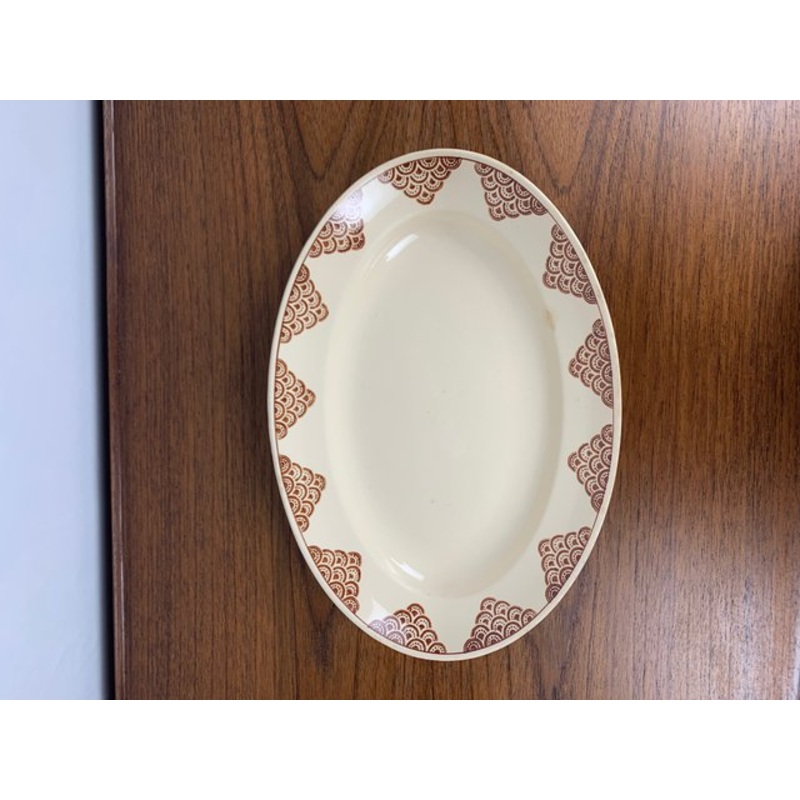 Oval dish "amandinoise", St AmandGeometric pattern in cream and brown/orange colorsDimensions: 34 x 23.5 cmHeight: 4.5cmOld object, retains traces of time (see photos, micro scratches, discoloration/stain see photos) Manufacturer Saint amand Design Period