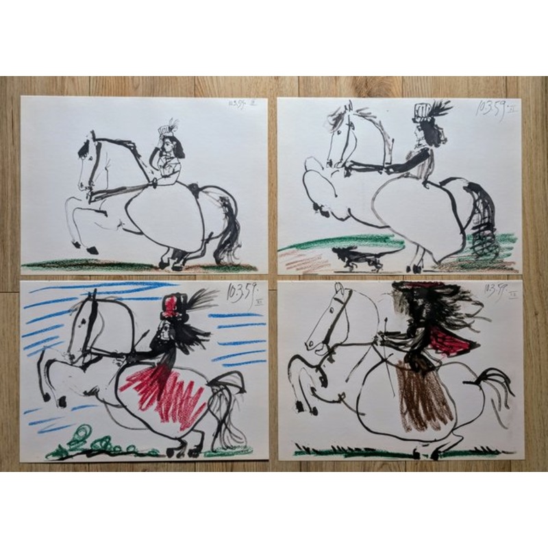 Pablo Picasso (1881-1973) - The Knight Woman/Jacqueline Riding - Four Color Lithographic impressions, 1961Lithographs in quadrochromy technique, from very 1st edition "Toros y Toreros" in 1961 (coa and documentation included).Size: 37 x 27 cm each.Publishe