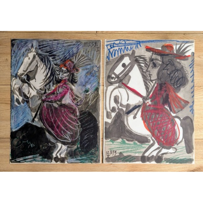 Pablo Picasso (1881-1973) - The Knight Woman/Jacqueline Riding - Two Color Lithographic impressions, signed and dated in the plate, 1961Lithographs in quadrochromy technique, from very 1st edition "Toros y Toreros" in 1961 (coa and documentation included).