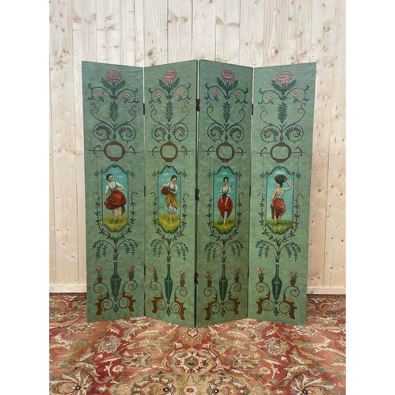 Artist: None Period: 20th century Style: Consulat, Empire Condition: Good condition Material: Solid wood Length: 160Width: 160Height: 180Depth: 3 Reference: 1496116 "Painted Wooden Screen " Painted wooden screen from the 1950s. Very good condition. Product