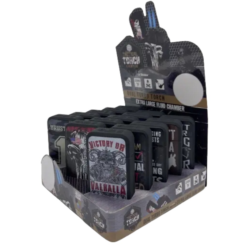 TacticalDual Torch Lighters feature a 2300 blue flame, perfect for camping, cigars, pipes, and candles. Also hasan extra large, refillable fluid chamber you won't have to worry about this torch going out! Each display includes a variety ofunapologeticphras