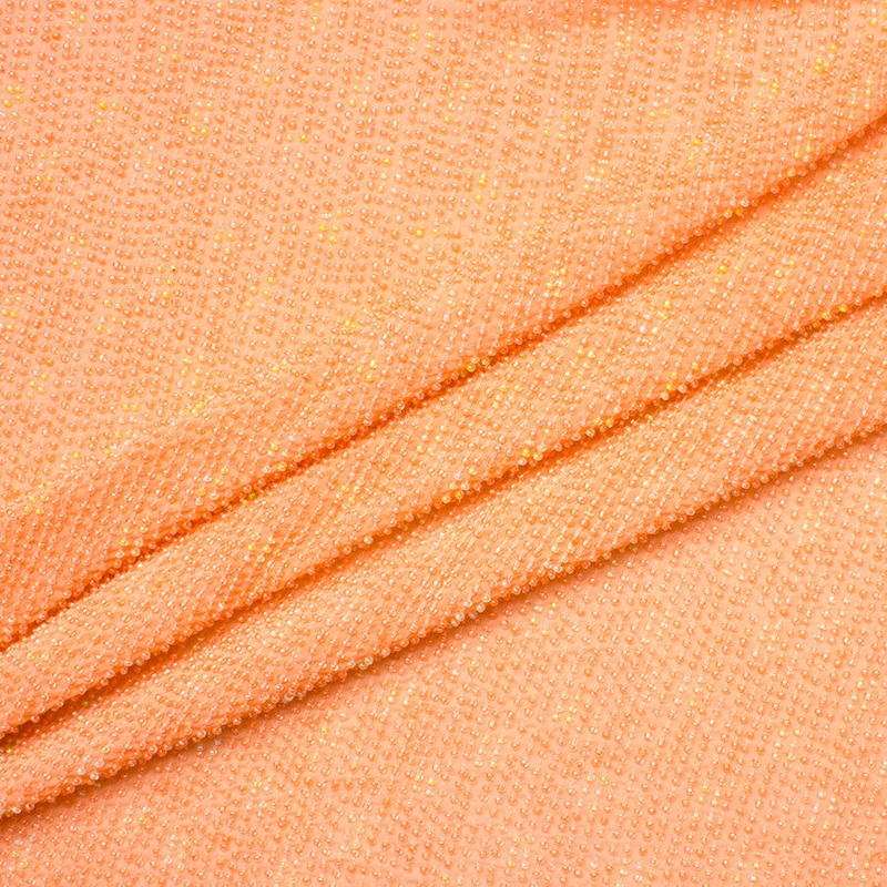 A striking peach coloured silk georgette with delicate beading. This heavily beaded fabric gives a wonderfully delicate and sophisticated couture look. Can be used for a dress, train or simply as an accompaniment to a bodice.