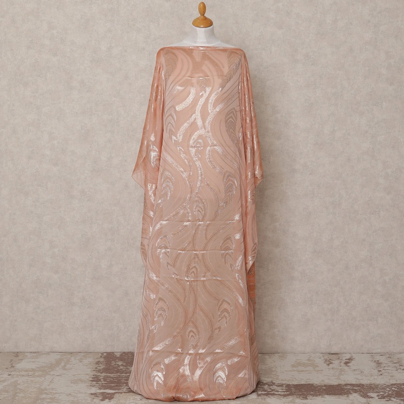 Be the first to review “Peach Fransawi Metallic Lurex Somali Silk Chiffon Dirac Fabric 3.5 Meters, Width 140 cm, Made in France-D24744”