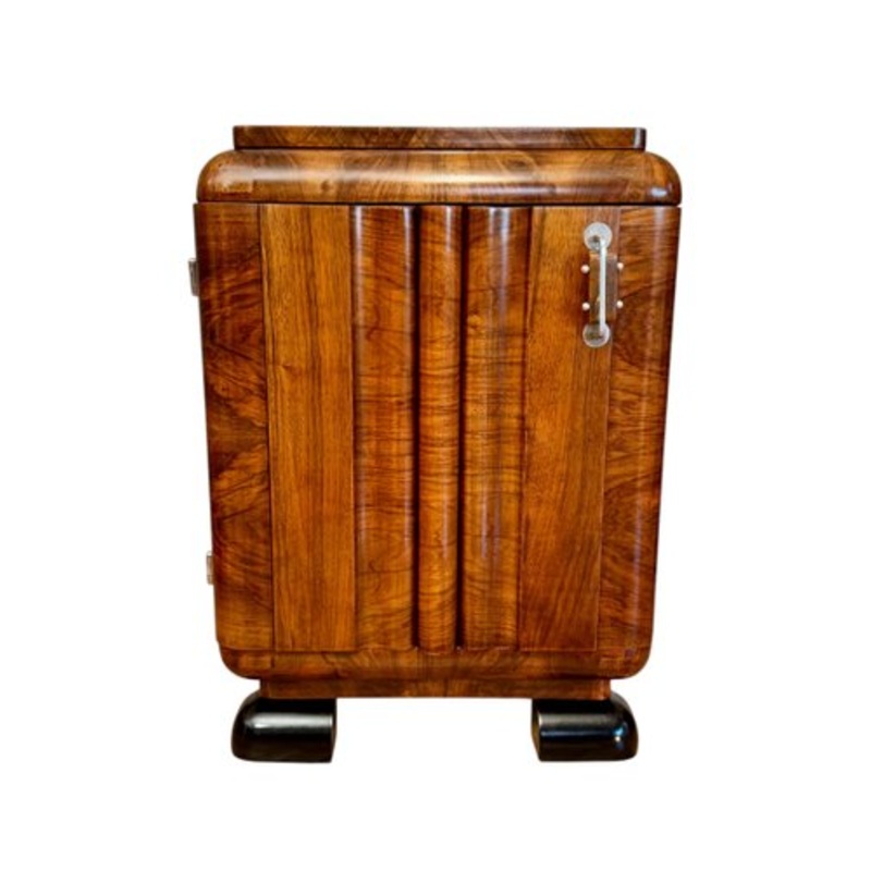 Art Deco small cabinet or nightstand, Europe 1920s. Spruce veneered in walnut root veneer, interior veneered in mahogany, fluted and column adorned front panel, ebonized legs, bakelite and chrome plated door knobs. Refinished in french polish, luxurious and historically accurate wood finish, light wear consistent to age, traces of use and time.