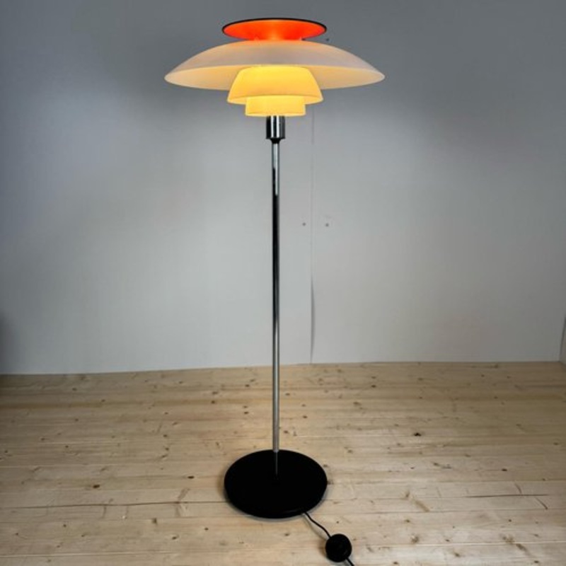 COUNTRY OF MANUFACTURE Denmark DESIGN PERIOD 1970 PRODUCTION PERIOD 1970 STYLE midcentury / danish design DESIGNER Poul Henningsen MODEL PH-80 PRODUCER Louis Poulsen MATERIAL opal acrylic, polycarbonate, ABS, chrome-plated steel COLOR white, red DIMENSIONS h. 130x 60 cm WEIGHT RANGE 0-40 Kg