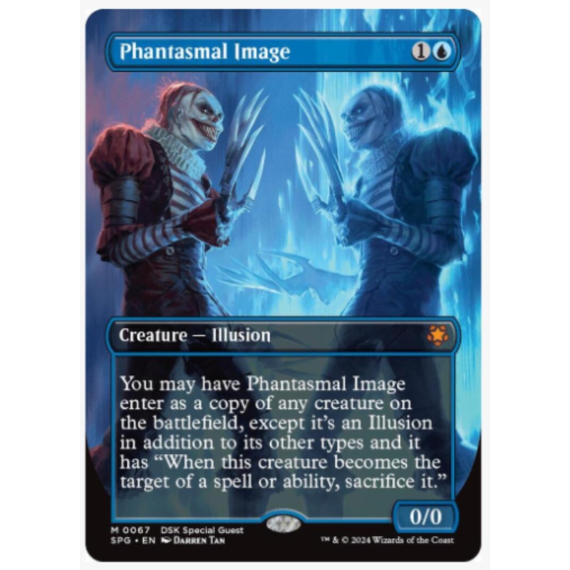 You may have Phantasmal Image enter as a copy of any creature on the battlefield, except it's an Illusion in addition to its other types and it has "When this creature becomes the target of a spell or ability, sacrifice it."Rarity:M#:67Card Type:Creature I