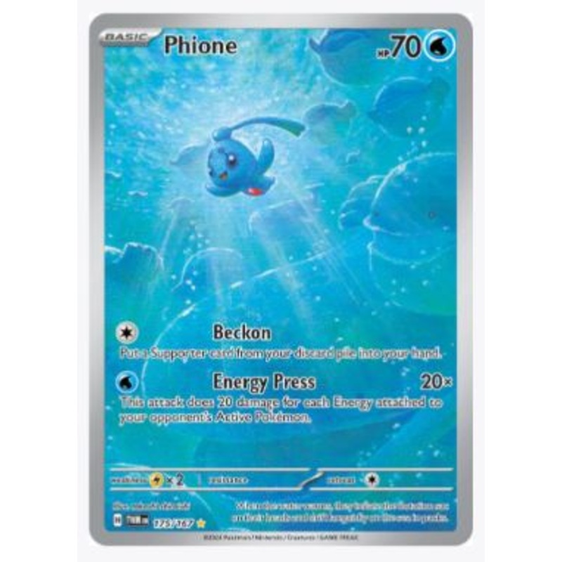 Card Number / Rarity:175/167 / Illustration RareCard Type / HP / Stage:Water / 70 / BasicAttack 1:[C] Beckon Put a supporter card from your discard pile into your hand.Attack 2:[W] Energy Press (20x) This attack does 20 damage for each Energy attached to y