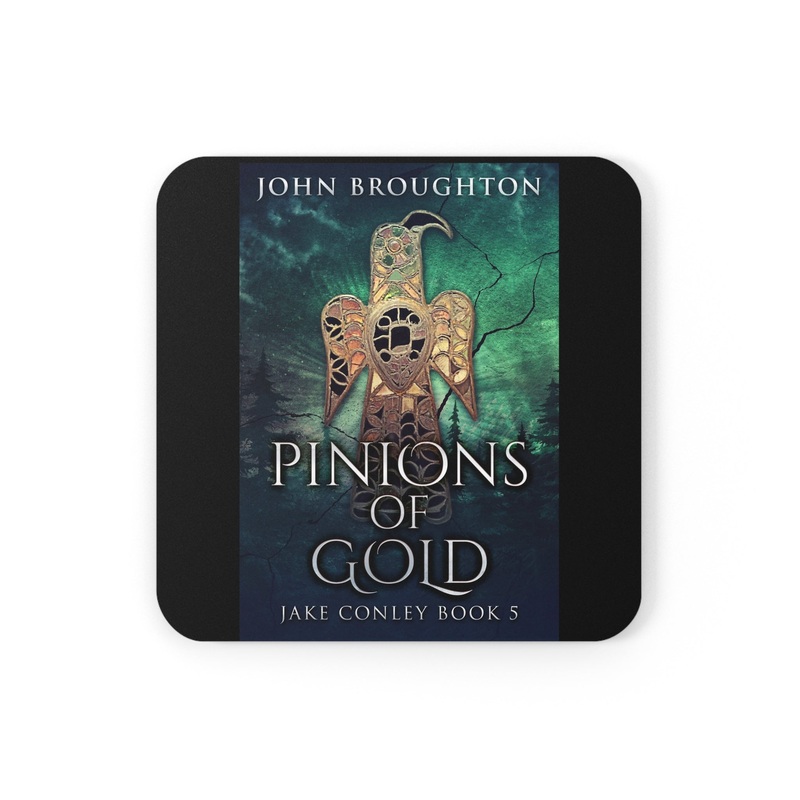 These coasters are made with a high-gloss top and feature a cork back to prevent sliding, and each order comes with a set of four coasters. The cover art in these coasters is from John Broughton’s book, Pinions Of Gold.