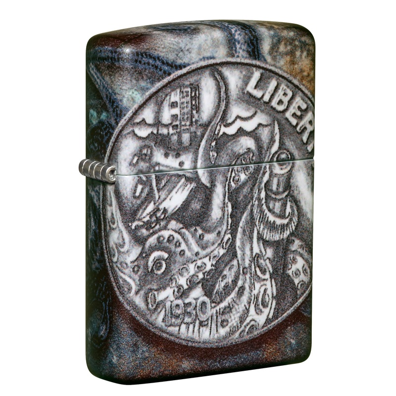 Shiver me timbers! Grab this Pirate Coin design before this treasure floats to the bottom of the sea to Davy Jones’ Locker. This design shows a pirate’s doubloon with a Kraken destroying a ship on it. Encircling the rest of the lighter are the sea monster’s tentacles. This design is created using Zippo’s 540 Color process, which allows for complete coverage of the lighters surface with precision artwork. Comes packaged in a gift box. For optimum performance, fill with Zippo lighter fuel.
