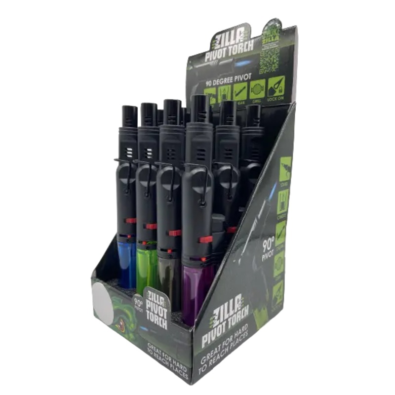 Smokezilla 45 Pivot Torch works at any angleeven upside down! Small enough to fit in your pocket, yet powerful and versatile enough for any task; from lighting candles, grills, bonfires and more! Safety cap stops ignition when closed. Refillable butane tank. Each display includes a variety of transparentcolor styles.