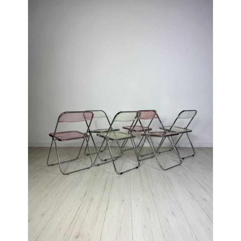Original Plia folding chairs from the 1960s, designed by Giancarlo Piretti for Anonima Castelli. Chrome-plated metal frame with transparent and light pink acrylic seats and backrests. Design classics. Made in Italy. Well-maintained condition with age-relat
