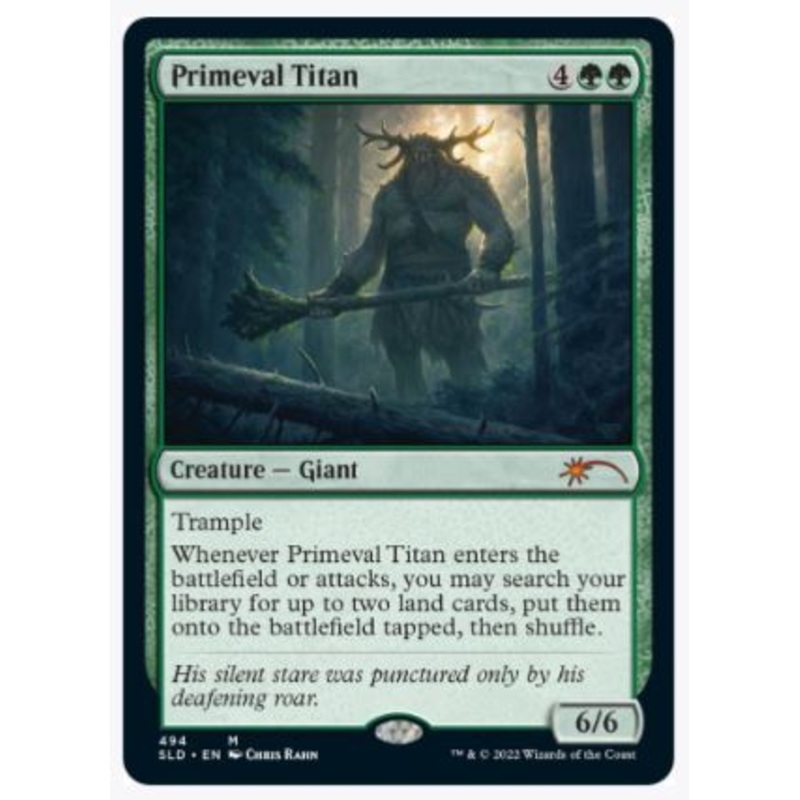 TrampleWhenever Primeval Titan enters the battlefield or attacks, you may search your library for up to two land cards, put them onto the battlefield, then shuffle.Rarity:M#:494Card Type:Creature GiantP / T:6 / 6Flavor:His silent stare was punctured only b