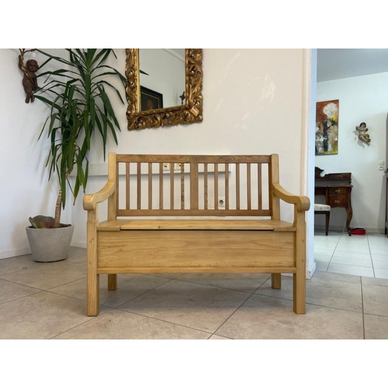 Old rustic country house bench chest bench bench dimensions: height 90 x 114 x 52 seat height 4755 For sale is a rural chest bench from around 1970, which was once made with great attention to detail. This rustic chest bench in the Art Nouveau style is a real jewel of provincial furniture craftsmanship. The bench stands firmly on four stable legs and impresses with its solid construction. Side armrests offer additional comfort, while the beautifully crafted backrest is decorated with delicate patterns that give the piece of furniture its special charm. The chest function is particularly practical, as it is ideal for additional storage space and makes the bench a versatile piece of furniture. This feature is completely intact and the chest bench has recently been completely restored. This chest bench is stable, clean and ready to give its new owner many years of enjoyment. Treat yourself to this unique piece while it is still available – a real highlight for any home!
