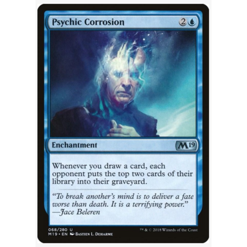 Whenever you draw a card, each opponent puts the top two cards of their library into their graveyard.Rarity:U#:68Card Type:EnchantmentFlavor:To break anothers mind is to deliver a fate worse than death. It is a terrifying power.Jace BelerenCasting Cost: 2U