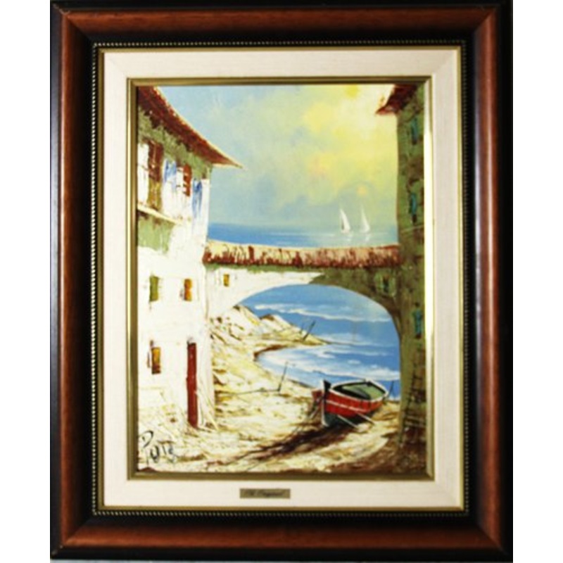The painting you see above shows a typical Spanish street that ends at the beach and can be found in Spanish villages. The artist used vivid colors to reach the level of detail of the painting. The details, which you can see on the painting, create a colorful contrast between the earthy colors of the walls, the cobbled road and a variety of colors. The painting will give your house a pleasant romantic note, adding more warmth to the room.