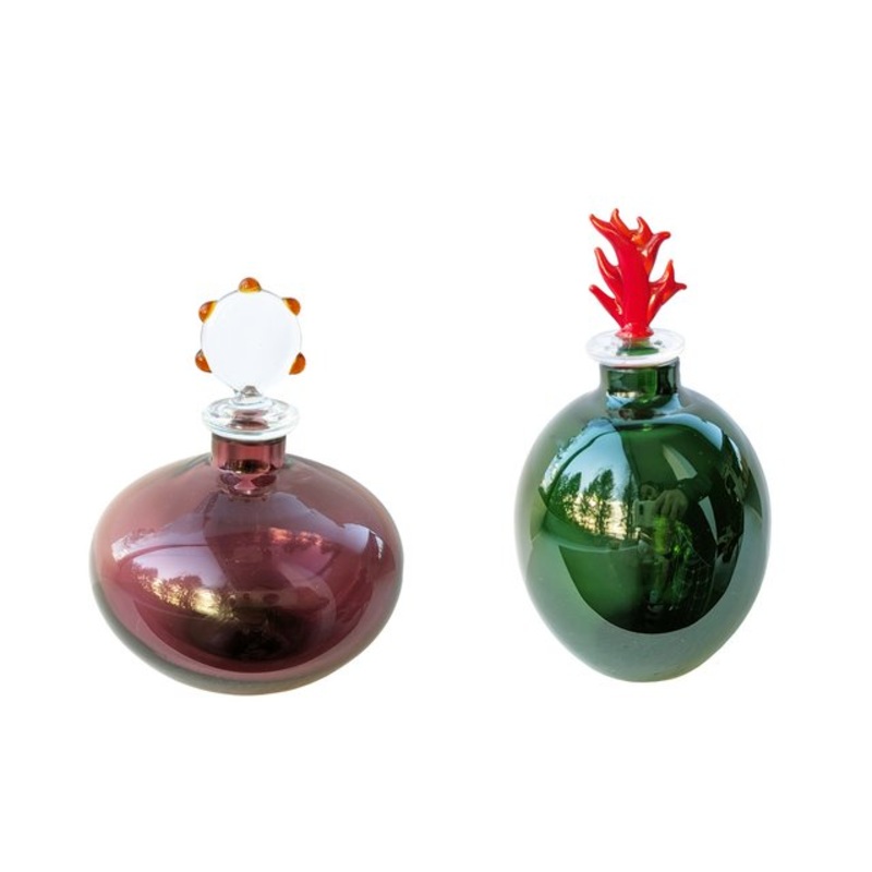 Set of 2 small decorative Murano flasks designed by Laura de Santillana and manufactured by Venini in the 1980s. the green flask shows a visible small chip at the neck as stated in picture. Overall good condition. Signature of the manufacture and date on e