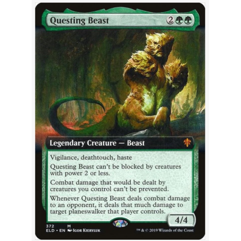 Vigilance, deathtouch, hasteQuesting Beast cant be blocked by creatures with power 2 or less.Combat damage that would be dealt by creatures you control cant be prevented.Whenever Questing Beast deals combat damage to an opponent, it deals that much damage