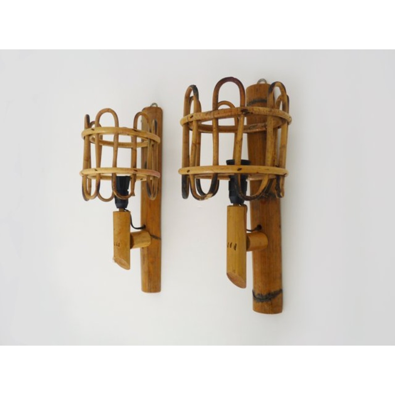 Pair of rattan bamboo lantern wall lights. 50s 60sVery beautiful pair of lantern-shaped wall lights, rattan and bamboo, made by artisans from the Marche region in Italy. These products are now impossible to find because it is forbidden to cut bamboo and th