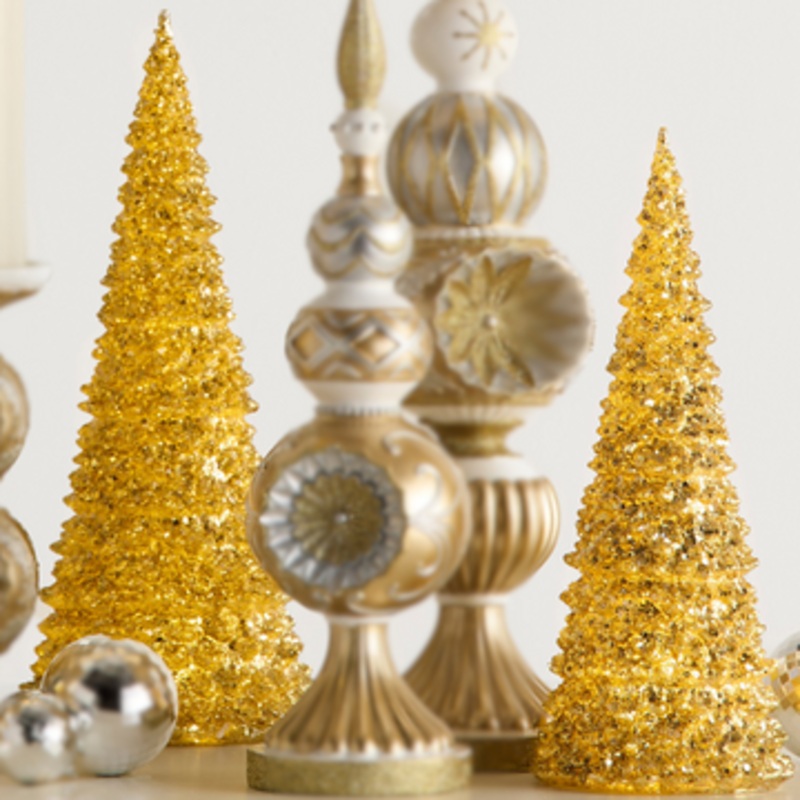 NEW for 2025 Brilliant metallic gold trees are sure to steal the show this Christmas! Turn them on and watch them sparkle! They are perfect to place on your mantle, on your coffee table, or on your counter!Requires 3 AA Batteries, not included.Made by Raz