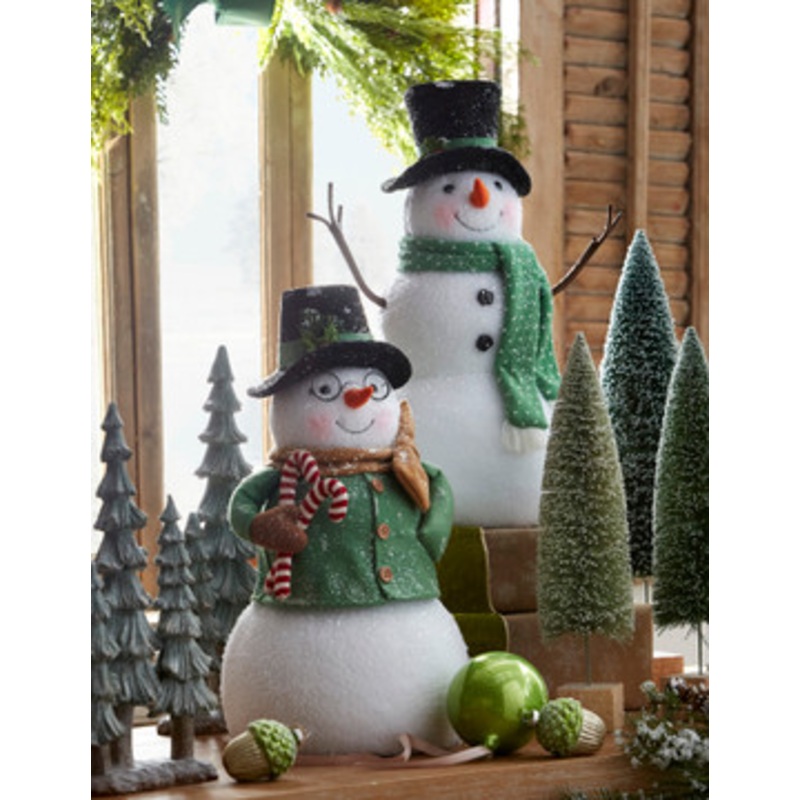 Brrr! These chilly snowmen look like they’ve just stepped in from a snowy woodland stroll! One wears a green polka dot scarf, while the other dons a green jacket with brown buttons and a pair of wire glasses. Both wear classic black top hats and are lightly dusted with faux snow for a frosty finish. A charming duo to add a cozy, wintry touch to your Christmas dcor!Each sold individually.Made by Raz Imports.Made ofpolyester, foam, acrylic, and cement.Dimensions:13.5″L X 10″W X 18.5″H; 10″L X 10″W X 18″H.Item #: 4516468