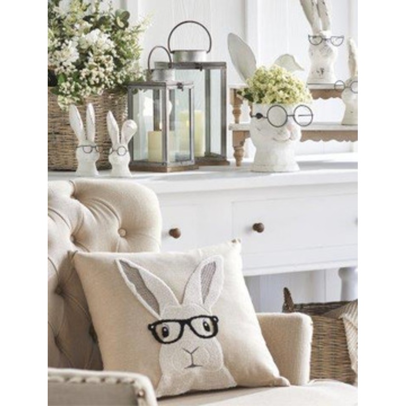 NEW for 2023 Need a quirky addition to your living room this year?? We got you! This Easter pillow features a white rabbit with a pair of thick framed glasses on! Perfect for living rooms, spare bedrooms, or even kids rooms!Made by Raz Imports.Made of cott
