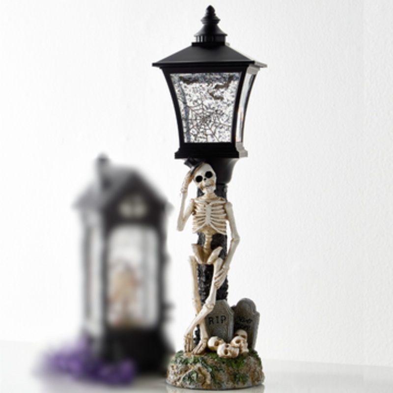 NEW for 2025 Raz 19" Lighted Swirling Glitter and Bats Skeleton Water Globe Lamp Post Halloween Decoration adds spooky sparkle to your Halloween setup! This fun piece features a laid-back skeleton leaning against a tall black lamp post filled with swirling