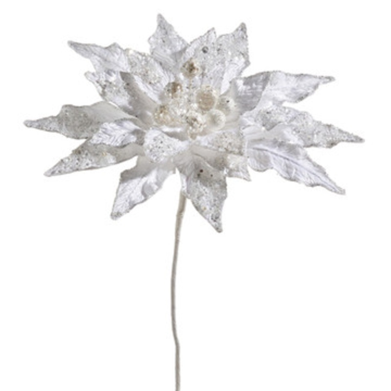NEW for 2024 This large white poinsettia pick is exactly what your Christmas tree is missing to really take it over the top! It has large white velvet leaves that are decorated with white glitter and beads- perfect to scatter through your tree or on your f