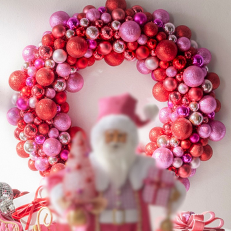 *You are purchasing a pre-order. Estimated Ship Date 10/15/25** Please read all about Pre-OrdersHERE Make a statement this holiday season with a stunning wreath as your focal point! This one is made up of varying sizes of shades of red and pink with silver