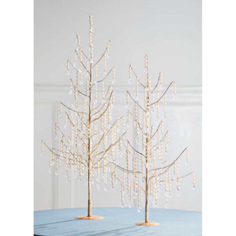 Made of shimmering gold, these trees have branching dripping with pearl drops and tipped with clear crystals! You get a 29.5″ tree and a 24.5″ tree!Sold as a set of 2.Made by Raz Imports.Made of plastic and iron.Dimensions:11″L X 9.5″W X 29.5″H; 8″L X 7.5″W X 24.5″H.Item #: 4517612