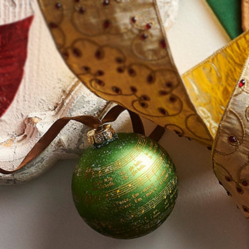 NEW for 2023 This stunning ornament features a green glass ball with gold sheet music printed on it! Perfect to add a few of these to your Christmas tree or add them into a wreath or garland!Made by Raz Imports.Made of glass.Dimensions: 3".Item #: 4320916