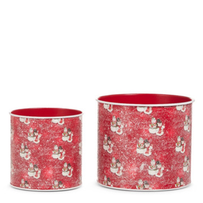 Perfect red cannisters are wrapped with a red paper decorated with a vintage inspired snowman couple and “Winter Wishes” dusted with a fine snowy glitter!Set of 2.Made by Raz Imports.Made of iron and paper.Dimensions:6.5″D X 5.5″H; 4.75″D X 4.75″H.Item #: 4559217