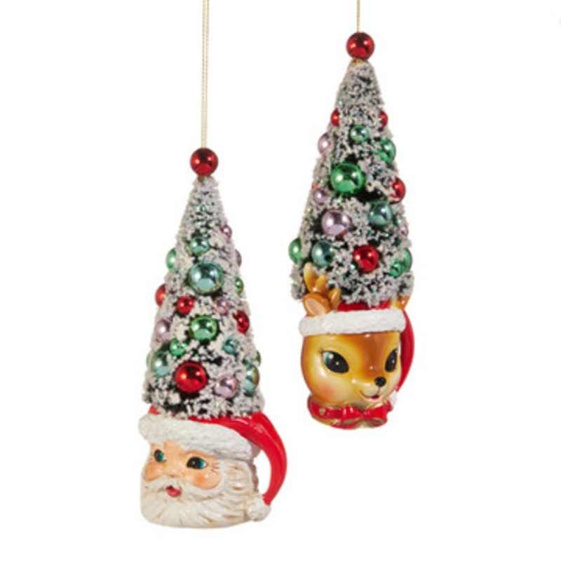 Calling all vintage lovers! Add a touch of nostalgic charm to your holiday dcor with these adorable mug ornaments. Choose a cheerful, blushing Santa with bright blue eyes or a sweet reindeer in a festive red hateach one holding a tall sisal bottle brush tree dusted with snowy white flocking and sprinkled with pastel ornaments. Perfect for bringing retro sparkle and whimsy to your Christmas tree or holiday displays! Each sold individually.Made by Raz Imports.Made of sisal and resin.Dimensions:2.5″L X 2″W X 6″H; 2.25″L X 2.5″W X 6″H.Item #: 4520098