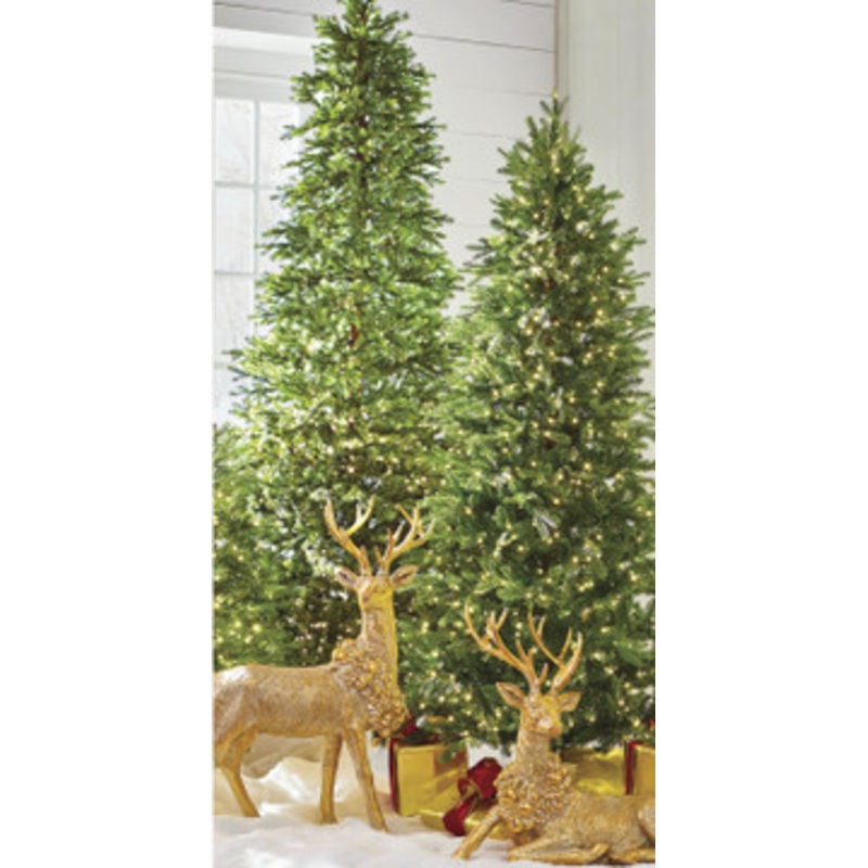 NEW for 2023 Grab a new tree for the holidays this year! Each tree is made of fluffy spruce branches with a slim design to fit more easily into your space! Dimensions: 7.5' Tree: 7.5' tall.Tree Diameter 45".2244 Tips.800 Warm White LED Lights. 9' Tree: 9'