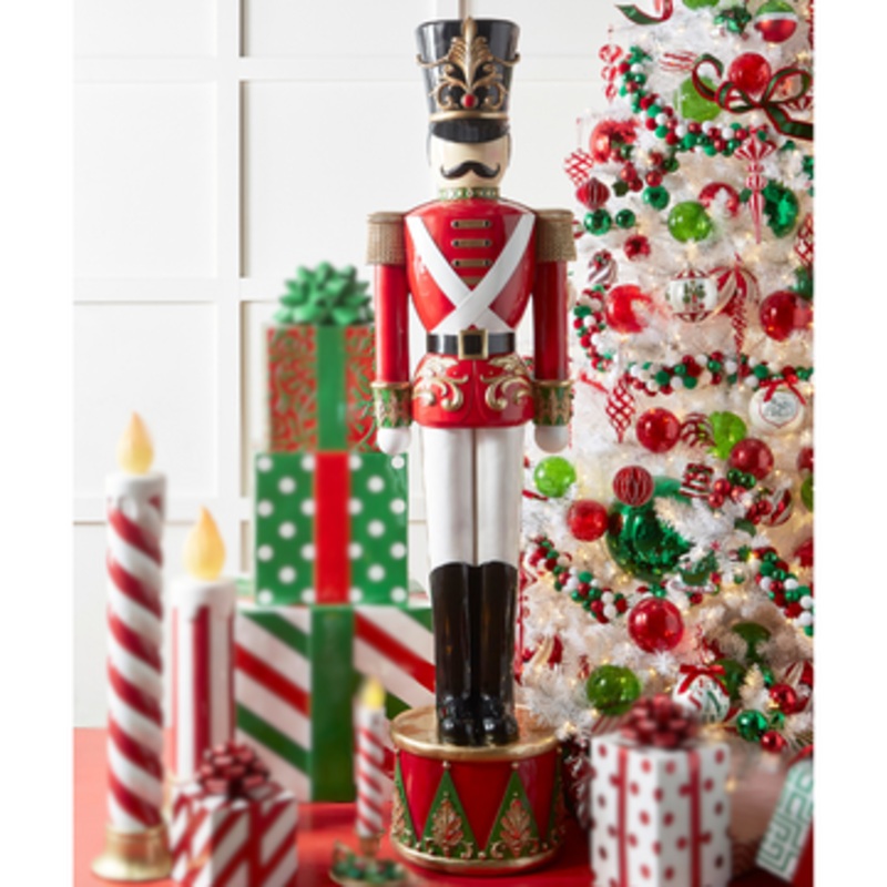 NEW for 2025 Standing just shy of 6', this is a MUST HAVE for any party lover who likes to go all out! A toy soldier wearing a red jacket with a white cross pattern over the front, gold scroll detail work, and green cuffs! His white pants tuck into tall bl