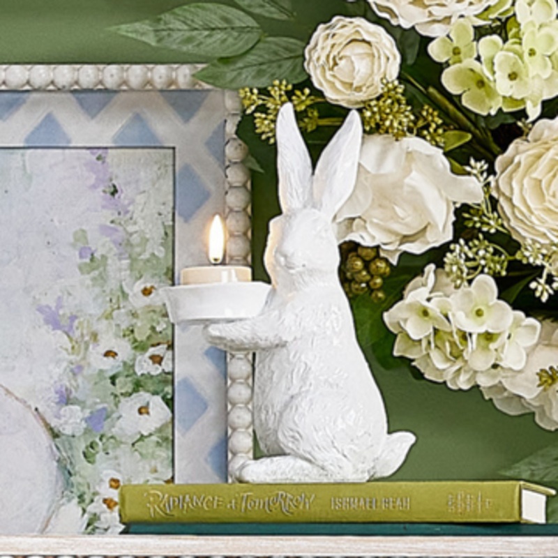 NEW for 2025 Add a touch of light this Easter with this subtle candle holder! It features a white bunny statue holding a small pedestal that perfectly fits a tealight!Use battery operated candles only. Holds a standard sized tealight (not included).Made by