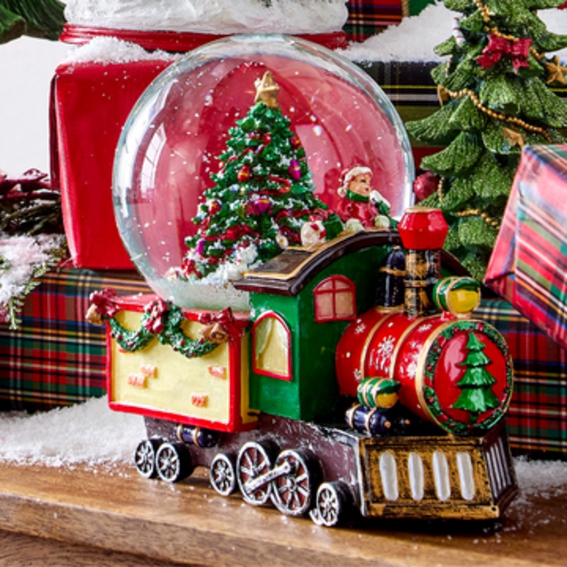 NEW for 2025 ALLLLLLL aboard! Add a touch of vintage to your home this holiday with this cute as can be snow globe! Featuring a base that s made of a colorful train decorated with green garland, tiny white snowflakes, red bows, and golden bells! The train